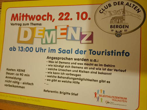 Der Club der Alten Bergen hat einen sehr informativen Vortrag zum Thema Demenz mit Frau Brigitte Steif für Mittwoch, den 22.10.2025, um 13 Uhr im Saal der Tourismusinfo in Bergen organisiert. Eine Anmeldung ist nicht erforderlich.